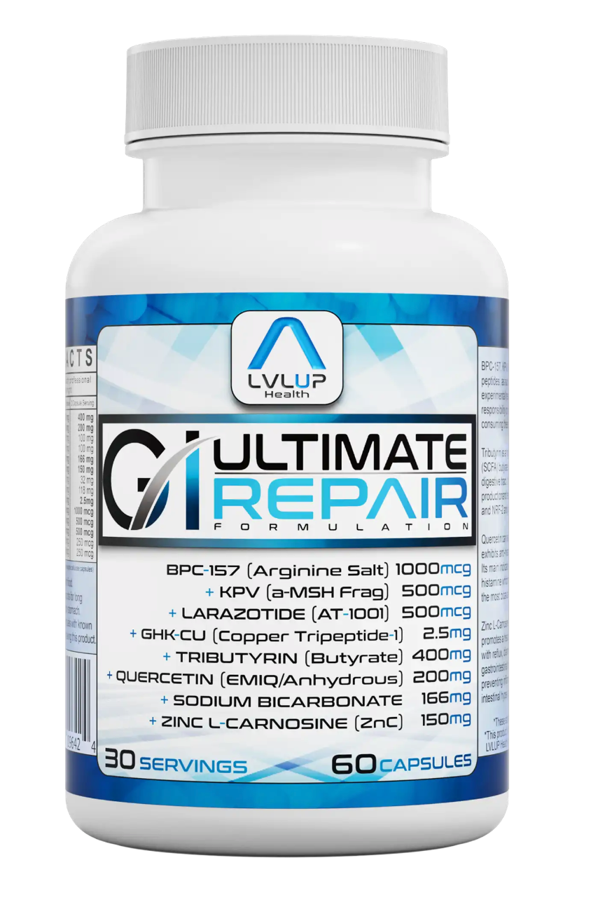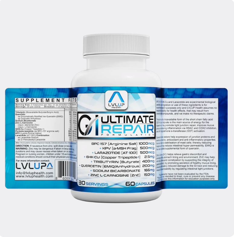 Ultimate GI Repair by LVLUP Health is a daily formula for individuals seeking advanced gastrointestinal support. This blend unites four orally bioavailable peptides with targeted nutraceuticals, supporting distinct aspects of gut barrier structure and immune regulation. It also helps enhance recovery from dietary and lifestyle stressors. Manufactured under GMP with rigorous third-party testing for quality.
